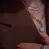 Our Dila necklace is meticulously crafted with pave diamonds and gold, showcasing its striking geometric design. It lays beautify on your neck and pairs well with many other pieces but also makes a statement on its own.